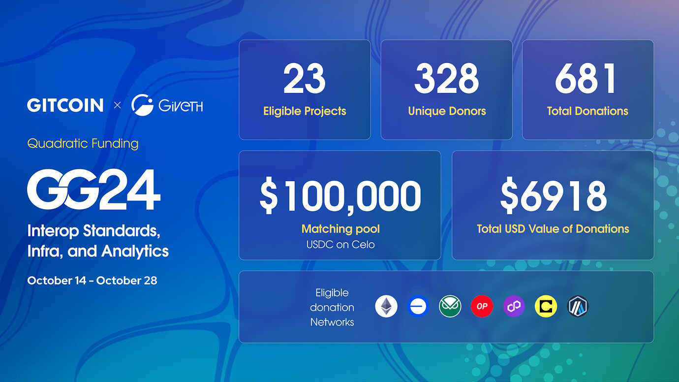 This inaugural Interop Standards, Infrastructure & Analytics round would not have been feasible without strong ecosystem collaboration. The Gitcoin team (@Sov, @LuukDAO, @onworks) played a critical role in exploring funding pathways, supporting round design, and amplifying outreach. Giveth's partnership (@karmaticacid, @yegor, Ashley) was instrumental in executing the round and enabling community-driven allocation, while Celo's timely co-funding provided crucial support that helped anchor the matching pool.